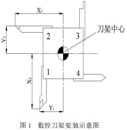刀具位置尺寸補(bǔ)償?shù)膶?shí)質(zhì)是將刀具相對(duì)于工件的坐標(biāo)由刀具安裝的定位點(diǎn)移到刀尖位置。以最簡(jiǎn)單的四工位數(shù)控車(chē)床旋轉(zhuǎn)刀架為例,由圖1可以看出,刀具1 相對(duì)與刀架中心的坐標(biāo)為 X1 、Y1 ,刀具2相對(duì)于刀架中心的位置為X2 、Y2 ,因?yàn)閿?shù)控車(chē)床刀具安裝系統(tǒng)的特性,即便是尺寸完全相同的兩把刀具安裝在同一臺(tái)數(shù)控機(jī)床的旋轉(zhuǎn)刀架上,其相對(duì)于刀架中心的尺寸也不可能完全相同,所以需要通過(guò)對(duì)刀操作以補(bǔ)償因?yàn)椴煌毒呦鄬?duì)于刀架尺寸不同而在換刀時(shí)出現(xiàn)的刀尖不重合的現(xiàn)象,簡(jiǎn)言之,就是要通過(guò)車(chē)刀位置尺寸補(bǔ)償來(lái)使不同尺寸的車(chē)刀在同一個(gè)工件坐標(biāo)系的坐標(biāo)中運(yùn)動(dòng)。數(shù)控車(chē)床對(duì)刀設(shè)置的方法一般有試切對(duì)刀、機(jī)械對(duì)刀儀對(duì)刀( 接觸式)、光學(xué)對(duì)刀儀對(duì)刀( 非接觸式) 等。