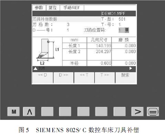 在SIEMENS 數(shù)控系統(tǒng)中,使用 Txx 調(diào)用刀具,其刀具補(bǔ)償號(hào)由 Dx x 指令指定,其后的數(shù)字表示刀具偏置存儲(chǔ)器號(hào)。例如 T01 D01 ,如圖5所示,對(duì)應(yīng)刀具位置補(bǔ)償中,長(zhǎng)度 1 就是X 軸方向的補(bǔ)償,長(zhǎng)度2 就是Z 軸方向的補(bǔ)償,刀具圓弧半徑補(bǔ)償值 R 填在半徑存儲(chǔ)器里。與 FANUC系統(tǒng)相同,其中一般將對(duì)刀結(jié)果存儲(chǔ)在長(zhǎng)度對(duì)應(yīng)的幾何尺寸中,而長(zhǎng)度對(duì)應(yīng)的損存儲(chǔ)器一般用于輸入切削余量和修正對(duì)刀結(jié)果以及由于刀具磨損形成的零件加工誤差。在自動(dòng)執(zhí)行過(guò)程中,數(shù)控系統(tǒng)調(diào)用該存儲(chǔ)器中的長(zhǎng)度1 、長(zhǎng)度2 、半徑的幾何尺寸和磨損值疊加的數(shù)值,自動(dòng)修正刀具的位置誤差和自動(dòng)進(jìn)行刀尖圓弧半徑補(bǔ)償[ 3 ]。