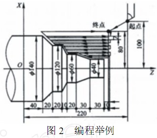 加工如圖 2 所示零件 ,其毛坯為棒料。工藝設計規定:粗加工時切深為 7 e ,進給速度為 0. 3 e /r ,主軸轉速 500r/ min ,精加工余量 X向為 4mm ,Z向為 2mm ,進給速度為 0. 15 e / r ,主軸轉速 800r/min。程序設計如下:
