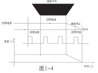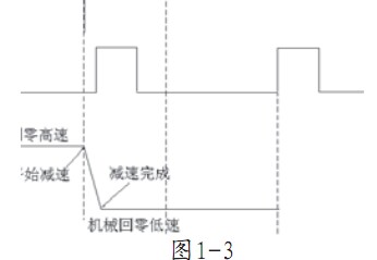 b. 反向運行中,再次壓上減速開關,減速觸點信號斷開時,仍以回機械零點運行;當運動離開減速開關,減速信號觸點重新閉合,系統開始檢測編碼器的一轉信號,如果該信號電平跳變,則運動停止,同時操作面板上相應軸的回零結束指示燈亮,機械回零操作結束。