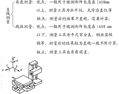 首先我認為在我們實際裝配和調試過程中數控機床直線度測量方法通常可以分為以下兩大類:一類為線性測量。即測量的基準為平直實體要素。如平尺或鋼絲繩等;另一類為角度測量。即它的測量基準通常采用如大地水平線或是光束等。其兩種測量方法有其優點也缺點如下圖所示。