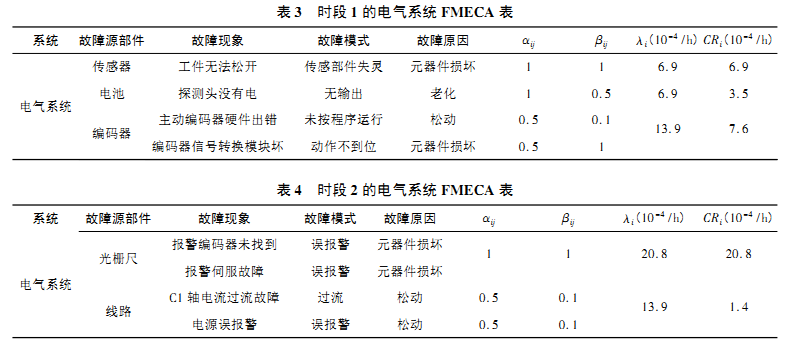 通過FMECA分析表能夠直觀地分析出哪種故障對 生產的危害度最大。由表3得出,時段1時的編碼器危害 度大于其他2項,是加工中心在時段1時最應該加以防護 的危害。在時段2時,光柵尺危害度達到了 20. 8,是整個 系統中危害度最大的一項,而且都是因為光柵尺損壞造成 的,在日常維修工作中還需改善光柵尺選型及定期清理等 相關工作。從時段1和時段2的FMECA分析表中得出,2 個故障器的電氣系統常見故障危害度并不相同,這是因為 加工中心在不同的時間段里會表現出不同的故障,所以, 對加工中心不同故障時期的研究是有著重要的現實意義 及實用價值的。