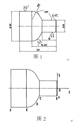 圖1所示的零件主要由 40軸 R30半球臺 40軸及R30半球臺間的圓錐及 100軸等四段幾何體組成組合體 工件外輪廓主要由線段AB BC CD EF及圓弧DE組成 根據數控車床加工的特點 該零件只需要左端裝夾就能加工而成 因此 可選右端面的中心點0作為工件編程坐標原點 工件輪廓基點分別是A B C D E F點為了編制滿足零件需要的加工程序 就必須確定各基點在編程坐標系中的坐標
