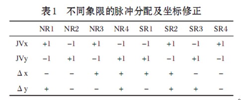 具體方法是, 設(shè)置JVx、 JVy為積分函數(shù)寄存器, JRx、 JRy為余數(shù)寄存器。在起點時, JVx和Jvy分別寄存起始坐標(biāo)X0、 Y0,對于第一象限逆圓來說, 在插補過程中, JRy每溢出一個Δy脈沖, JVx應(yīng)該加1; JRx每溢出一個Δx脈沖, JVy應(yīng)減1。對于其他各種情況的DDA法圓弧插補, JVx和Jvy是加1還是減1, 取決于動點坐標(biāo)所在象限及圓弧走向[2]。