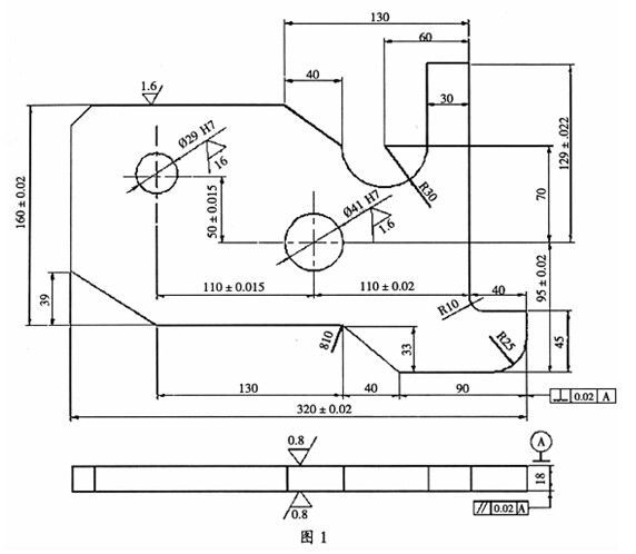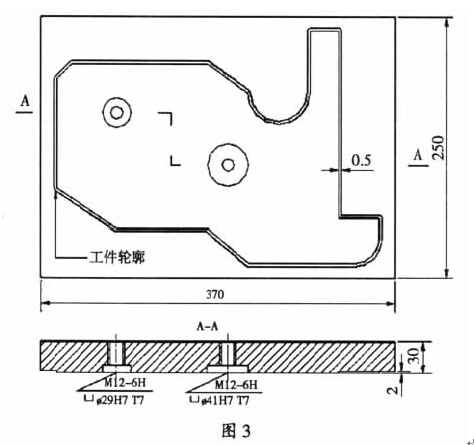 從上述工藝流程來看,在第2步加工時,采用一而兩孔定位的裝夾方法來加工,山于工件外形質量要求較高,因而對夾具的底板(圖2)部分做了修改,避免刀具底齒的磨損與輪廓的一致,提高了刀具的使用壽命如用一般一而兩孔定位的裝夾方法來加工,工件底而將會留有0.1-0.2mm的余量,山于夾具平行度誤差及刀具底齒的擠壓切削,增大了刀具的磨損,使得工件底層的余量部分難以去除通過對夾具底板的改進,則大大減少了勞動強度,提高了產品生產的效率.因此在此類工件的加工工序中主要考慮零件的裝夾及定位.
