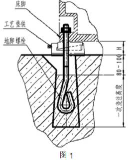 基礎(chǔ)二次灌漿分兩次進(jìn)行 將按比例混合好的細(xì)砂 水泥灌入二次澆注坑內(nèi) 上部預(yù)留80-100mm高度空間 圖1 控制H值 按鐵鐵的最小高度值加1-2mm便于安裝機(jī)床本身的調(diào)整墊鐵 并用小型振動(dòng)棒夯實(shí) 固化養(yǎng)生3-4天