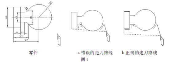 外圓刀經(jīng)常撞刀現(xiàn)象如圖1 這種情況,主要在退刀的過程中 G00 走刀路線是折線或者是直線而且進給速度快并且不受操作者控制,本例中刀具加工到 40 這個外圓后進行退刀,在其刀具退回目標點時移動路線中與 SR25 球發(fā)生干涉,與工件發(fā)生碰撞,造成撞刀 這個圖的編寫: