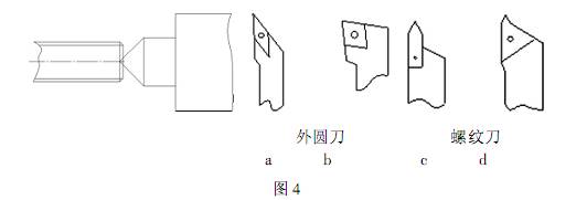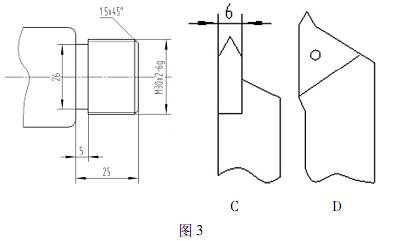 如圖3 用 C 這樣的一把螺紋刀進行切削加工,在編寫程序時 G92X29. 1 Z - 23 F2 中的 Z - 23 是沒有考慮到所使用的刀具,Z 值應該小于且減去螺紋刀尖寬度的一半,z 值小于25 - 3 即小于22,在實際編寫中考慮 Z 向對刀誤差等因素,這個程序應改為 G92 X29. 1 Z -21. 5 F2 ,就可以加工了 如果用的是 D 這樣螺紋刀具在,z 值可以用原來的程序進行加工