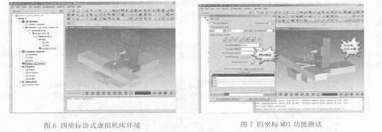 通過(guò)以上工作, 最終構(gòu)建完成的四坐標(biāo)臥式虛擬機(jī)床環(huán)境如圖6 所示. 工藝編程人員可以直接應(yīng)用該虛擬機(jī)床對(duì)加工程序進(jìn)行仿真、校驗(yàn). 為了保證機(jī)床環(huán)境的正確性, 通過(guò)MDI 方式對(duì)機(jī)床進(jìn)行測(cè)試, 其測(cè)試結(jié)果如圖7 所示.