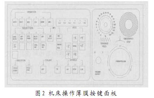 綜合實驗裝置由兩部分組成:一部分是數控系統控制部分;另一部分是伺服放大和電機等強電執行部分。在控制部分,主要安裝有FANUC控制器、CRT/MDI、外置I/O模塊、機床操作面板、模擬操作和顯示平臺等。設計的機床操作面板如圖2所示。在執行部分,主要安裝兩軸伺服放大、主軸變頻器、主軸位置編碼器、伺服電機和主電機、刀架電機以及機床電器等,除機床的機械部分外,數控機床電氣都清楚安裝在實驗臺上,加上器件透明安裝,容易理解數控機床電氣組成。