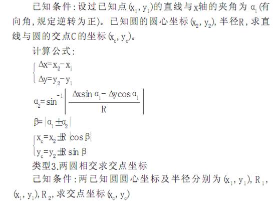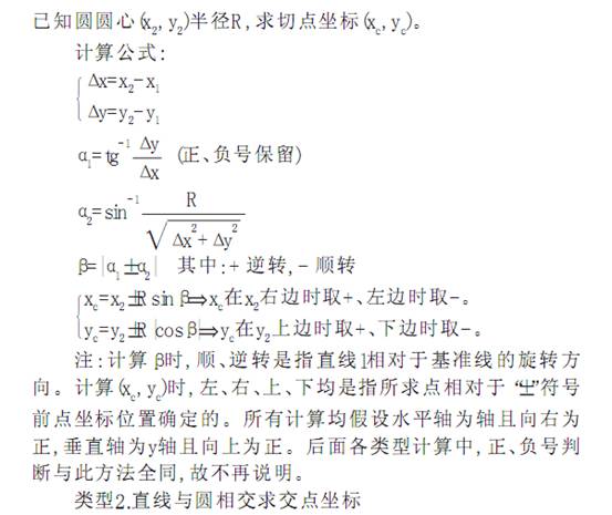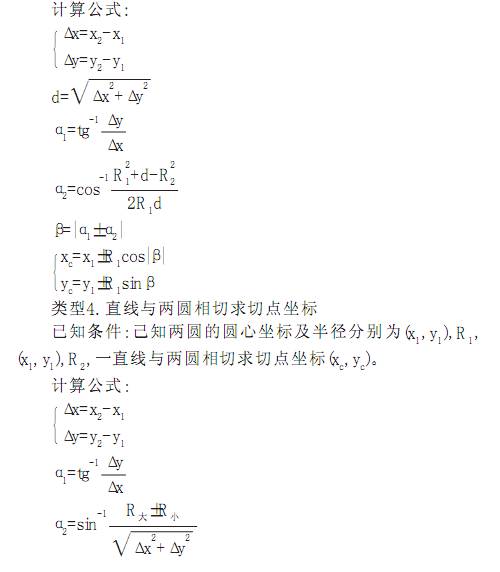 以上四種類型對任何象限任何方位的基點計算, 只要根據以上條件確定出(x1, y1)、 (x1, y1)及R1、 R2等, 就可套用上述相應公式求解。需要注意的是計算或確定α 1時, 若為負值, 不可丟掉負號, 計算β 時, α 2為有向角, 是自基準線向規定的直線旋轉, 逆轉為正, 轉角指不大于90° 的那個角。計算(xc, yc)時也應弄清是相對于哪一點計算。