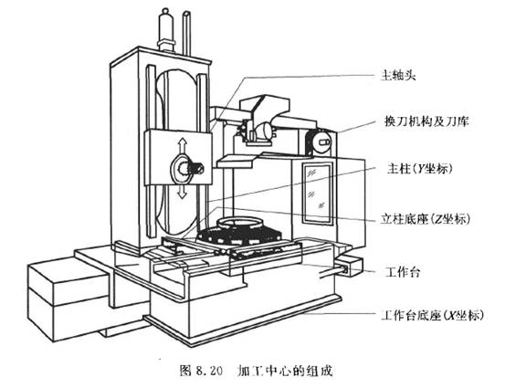 加工中心由主軸頭、換刀機構(gòu)及刀庫、立柱、立柱底座、工作臺、工作臺底座等組成,如圖8. 20所示。加工中心的數(shù)控系統(tǒng)能使其按照不同工序自動選擇和更換刀具,能自動改變機床主軸轉(zhuǎn)速、進(jìn)給量、刀具相對工件的運動軌跡及其他輔助功能,能依次完成.工件多個表面上多個工序的加工。