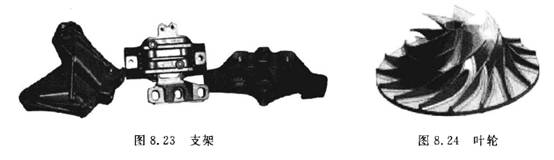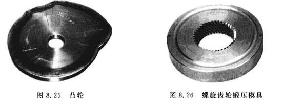 (3)模具類零件。模具常見的有鍛壓模具、鑄造模具、橡膠模具和注塑模具等。圖8. 26所示為螺旋齒輪鍛壓模具。利用數(shù)控加工中心進(jìn)行模具加工時,由于工序高度集中,動模、靜模等關(guān)鍵件的精加工基本上是通過一次安裝便能全部完成,尺寸累積誤差及修配工作量小。并且模具的可復(fù)制性強,互換性好。