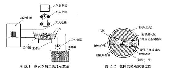 電火花加工原理如圖巧.1所示。工件接正極,工具接負(fù)極。工具電極和工件電極浸在液體介質(zhì)中,脈沖電源不斷發(fā)出電脈沖在工具和工件上,在兩極間形成電場。由于電極的微觀表面凹凸不平,當(dāng)兩極間的距離很小時(shí),極間相對最近點(diǎn)電場強(qiáng)度最大,最先被擊穿。液體介質(zhì)被電離成電子和正離子,形成放電通道。如圖15. 2所示。