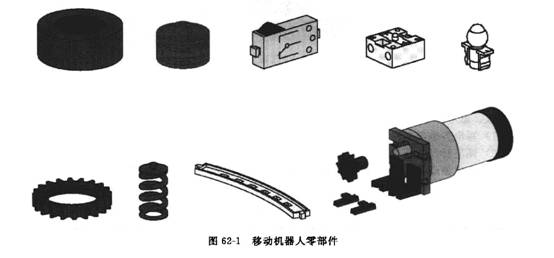 移動機器人模型組合包由各種連桿、直齒輪、錐齒輪、齒輪軸、蝸輪蝸桿、凸輪、絲杠螺母、萬向節(jié)、齒輪箱、鉸鏈、按鈕開關(guān)、車輪、電動機、光電開關(guān)和按鈕開關(guān)等組成,見圖6 2-1。該模型組合包采用積木式插裝結(jié)構(gòu),連接簡單方便,尺寸精確,采用這些構(gòu)件進行組合和設(shè)計,結(jié)合電氣控制元件可以得到各種不同的移動機器人模型。