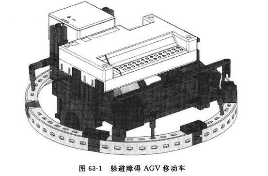 躲避障礙AGV移動(dòng)車見圖63-1,能夠在前方遇到障礙時(shí)自動(dòng)躲避并改變前進(jìn)方向。躲避障礙AGV移動(dòng)車由行走機(jī)構(gòu)、障礙檢測(cè)裝置、智能接口板和電源組成。該AGV移動(dòng)車使用下列輸人輸出設(shè)備:2個(gè)電動(dòng)機(jī),用于控制移動(dòng)車左右車輪的運(yùn)轉(zhuǎn),控制移動(dòng)車的行走;2個(gè)按鈕開關(guān)與凸輪配合作為旋轉(zhuǎn)編碼器使用產(chǎn)生脈沖信號(hào),分別控制所對(duì)應(yīng)左右車輪轉(zhuǎn)速;在移動(dòng)車左前方、右前方和正后方裝有限位開關(guān),用于檢測(cè)障礙物的方向,并發(fā)出信號(hào)。行走機(jī)構(gòu)由兩個(gè)主動(dòng)輪和一個(gè)無動(dòng)力的輔助輪組成,均安裝在車架上。電源和智能接口板安裝在車架上部。