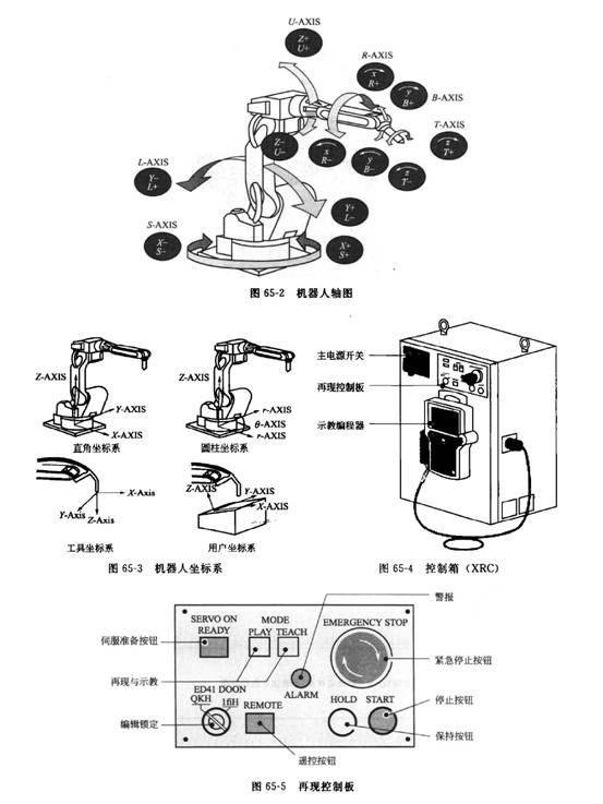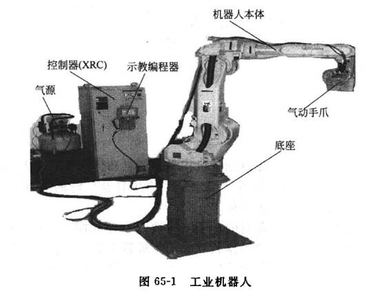 UP-6工業機器人具有六自由度,該設備主要由機器人本體、控制器(XRC)、示教編程器、氣動手爪、底座和氣源等部分組成,工業機器人組成見圖65-1 e