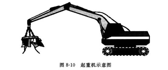 圖8-10是起重機示意圖。起重機的桿臂由一臺液壓缸驅動,該液壓缸所承受的是牽引負載,所以該液壓缸必須承受拉力。根據工作要求,液壓缸的活塞桿應該能夠停在任何工作位置,以確保重物能夠停在空中所需位置。回路中安裝溢流閥,為液壓缸提供背壓阻尼,以保證液壓缸能夠執行可控制的伸出動作。