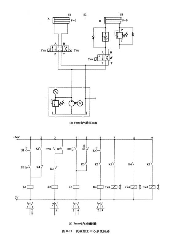 電氣液壓回路及電氣控制回路見圖8-14。按下啟動開關SB1實現進給運動,SB2控制回程運動。