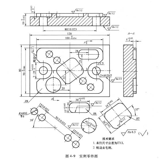 如圖4-9所示,零件外形規則,被加工部分的各尺寸、形位、表面粗糙度等要求較高。圖中包含了平面、內外輪廓、挖槽、鉆孔、鉸孔及銑孔等加工,且大部分的尺寸均達到IT8一I1"7級精度。