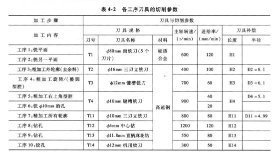 本次加工需要刀具8把,其具體規格見表4-2,毛坯尺寸為120mm x S}mm x 20mm,材料為45鋼。毛坯首先要進行定位面的銑削,當定位面銑好后方可進行工件的定位裝夾。工件安裝在機用平口鉗上,下方用平行墊塊墊著,保證工件上表面與鉗口底面裝夾的平行度。