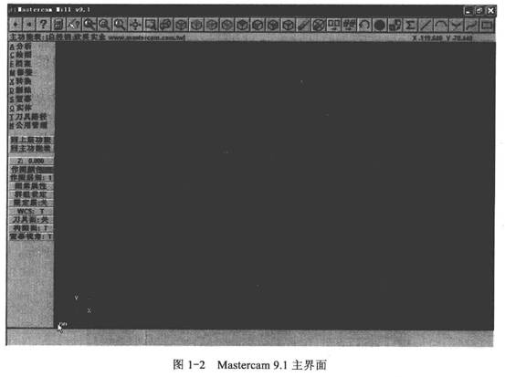 雙擊電腦桌面的 圖標,啟動Mastercam Mill 9.1,屏幕分為五個區(qū):窗口左上方為主菜單區(qū)、左下方為副菜單區(qū)、中間黑色部分為繪圖區(qū)、上方為快捷命令圖標區(qū)、下方灰色部分為系統(tǒng)提示區(qū),如圖1-2所示。此外,屏幕右上角顯示的(X} Y)坐標值表示了鼠標在移動時的位置,屏幕繪圖區(qū)左下角的坐標軸表示了系統(tǒng)當前的視角設置狀態(tài),而mm或inch表示系統(tǒng)當前設置的繪圖單位。
