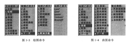 主菜單中的繪圖(Create)命令,包括了生成點、直線、圓弧、倒圓角·、曲線、曲面曲線、尺寸標注、倒角、文字、呼叫副圖、橢圓、多邊形、邊界盒、螺旋線、齒輪、圓表和自定義函數(shù)表達式繪圖等線框造型命令,以及曲面造型命令,如圖1-3所示。