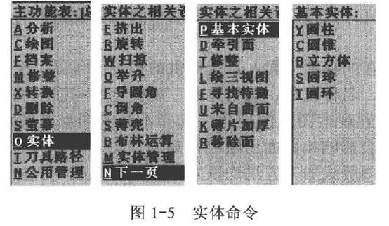 主菜單中的實體(Solid )命令,包括生成基本實體,擠出、旋轉、掃掠、舉升實體,對實體進行倒圓角、倒角、薄殼、布爾運算、管理和修改等,如圖1-5所示。
