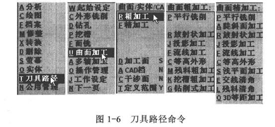 刀具路徑(Toolpaths)包括外形銑削、鉆孔、挖槽、面銑、曲面加工、多軸加工等加工操作,以及操作管理、工作設定等。曲面加工包括平行銑削、放射狀加工、投影加工、流線加工、等高外形、殘料粗加工、挖槽粗加工、鉆削式加工等8種粗加工方式,以及平行銑削、陡斜面加工、放射狀加工、投影加工、流線加工、等高外形、淺平面加工、交線清角、殘料清角、3D等距加工等10種精加工方式,如圖1-6所示。