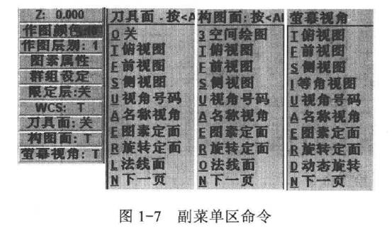 副菜單區(qū)包括Z: 0.000(工作深度設定Z: 0.000)、作圖顏色:10 (Color: 10)、作圖層別:1(Level: 1)、圖素屬性(Attributes )、群組設定(Groups)、限定層:關(Mask: OFF)、WCS:T、刀具面:關(Tplane: OFF )、構圖面:T <Cplane: Top)和螢幕視角:T ( Gview: Top)等命令,如圖1-7所示。