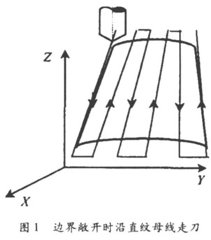 ① 當被加工曲面的邊界敞開 ,沒有其他表面或夾具等限制時 ,為安全起見 ,應延伸曲面邊界。或者設計一個能覆蓋被加工曲面的較大的曲面 ,使刀具從曲面的邊界外加工起。如圖 1所示 ,每次沿直線走刀 ,刀位計算簡單 ,程序段少 ,加工過程符合直紋面造型規(guī)律 ,保證母線的直線度。