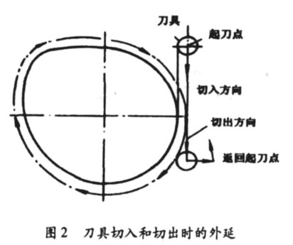 ③ 二維切削加工時 ,對精度要求較高的工件曲面 ,要避免法向切入工件曲面 ,而應與工件輪廓曲面的延長線相接觸 ,然后沿該曲線切向切入工件輪