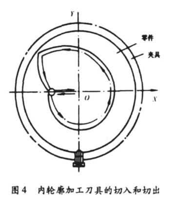 ④銑削內(nèi)槽封閉曲面的切入或切出不允許外延。這里可沿工件曲面的法線切入或切出 ,可能時 ,其切入和切出點最好選在工件輪廓曲面兩幾何元素的交點處 ,見圖 4。