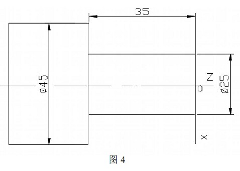 筆者認為在講解加工指令的同時應講解加工工藝, 以便讀者理解接受所講的加工指令。 在普通車床加工零件, 車床加工的切削用量, 工序工步安排以及走刀路線等內容, 往往都是由操作工人決定, 操作工人會按零件圖樣的技術要求, 按一定的切削深度, 逐層把毛坯的余量切除, 不會因吃刀深度太大而損壞車刀, 從而保證加工零件的質量。 而數控加工的所有工序工步, 切削用量, 走刀路線, 加工余量和所用的尺寸及類型等都要編入程序中, 編程可參照普通車床的逐層加工過程的原理, 使用有關的加工指令把加工過程逐層編寫出來即可。所以筆者在講授數控加工指令時, 會結合普通機加工的切削用量進行一起比較分析。 如上面所列的數控加工例子, 應在講解有關G01,G02, G03等指令時, 要講吃刀深度問題, 若吃刀深度過大, 可分層應用有關加工指令逐層編程加工, 最后一次走刀才按照零件圖樣的尺寸進行編程。這樣可避免初學數控加工的學員誤解數控加工工藝與數控加工指令的關系而產生困惑。經過按每次走刀的吃刀深度, 逐層加工編程之后, 初學數控編程的學員已經對加工指令有了初步的認識, 然后對車削加工余量較大,一個表面需要進行多次反復加工的零件, 為簡化編程可使用固定循環指令 (如G71、 G72、 G73、 G84 等) 編程加工, 若精度要求比較高的零件再配合精車循環(G70)進行編程加工。例如車削如圖 4 所示的臺階工件, 直徑從 45mm車至 25mm, 臺階長度為 35mm。