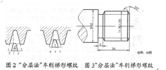 采用斜進法對標準螺紋來說,由于有固定循環指令,較為方便,但對異型螺紋加工就不太方便。下面介紹利用宏程序采用 “分層法” 切削加工梯形螺紋,該方法切削狀況好,對刀具要求不高,尺寸由程序中相應數值保證,當牙頂寬和螺紋底徑達到尺寸要求時,螺紋中徑等其他各項尺寸也相應達到尺寸要求,尺寸精度易于控制,螺紋表面質量好,甚至蝸桿和其它異型螺紋的加工也可套用該方法的編程思路。
