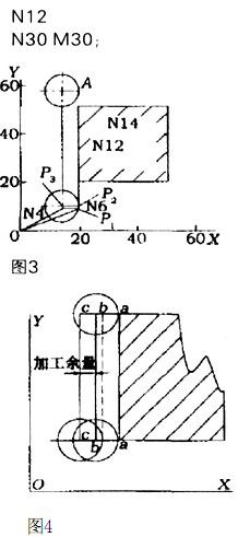 方法三:利用刀補指令使粗、精加工程序簡化。如圖4所示,可有意識地改變刀具半徑補償量,因為刀具半徑補償指令是按照刀庫表中的刀具半徑值而確定補償量的大小的,而不管實際用的刀具的半徑值的大小。那么,在應用時則可用同一把刀具、同一條程序、不同的切削余量完成加工。從圖4可以看出,當設定補償量為a c時,刀具中心按cc運動,第二次設定補償量為ab時刀具中心按bb運動完成切削。這樣就可以通過改變刀庫表的刀具半徑的參數,來完成多次切削而不用重新編寫程序。對加工不同材料的工件可以用同一條程序選用不同的加工余量進行精加工。其編程方法和以上相同。