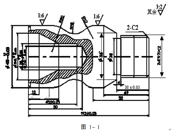 加工如下圖 1 - 1所示零件, 零件材料為 45#鋼,毛坯尺寸為 Æ 50mm @ 115mm, 試編制零件程序并加工。