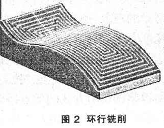 ( 2) 環行銑削( 圖 2) 。這種切削方式是同時對多張曲面進行加工的計算方法, 其走刀路線是以外輪廓的形狀由外向內(或由內向外)進行走刀, 是最常用的走刀方式之一。